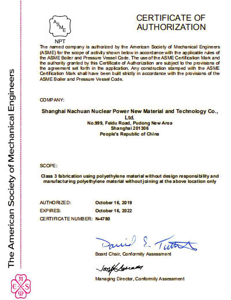 近日,完美(中国)一站式服务官网股份旗下子公司上海完美(中国)一站式服务官网申请的核3级HDPE管道制造许可获得美国ASME协会批准,并获得NPT证书,证书显示授权上海完美(中国)一站式服务官网生产的核3级产品包含:聚乙烯管道和管配件以及用聚乙烯材料制造核3级部件(不包含设计责任),上海完美(中国)一站式服务官网获得此项许可的HDPE管道生产企业;